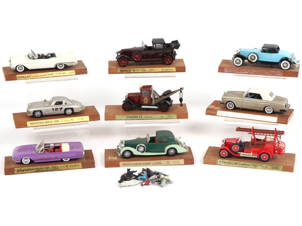 On y retrouve notamment les modèles : CITROËN C4F & RENAULT 40 CV - fixée sur socle en bois - on y joint un lot de personnages - véhicules encrassés - possibilité de manques ou parties cassées