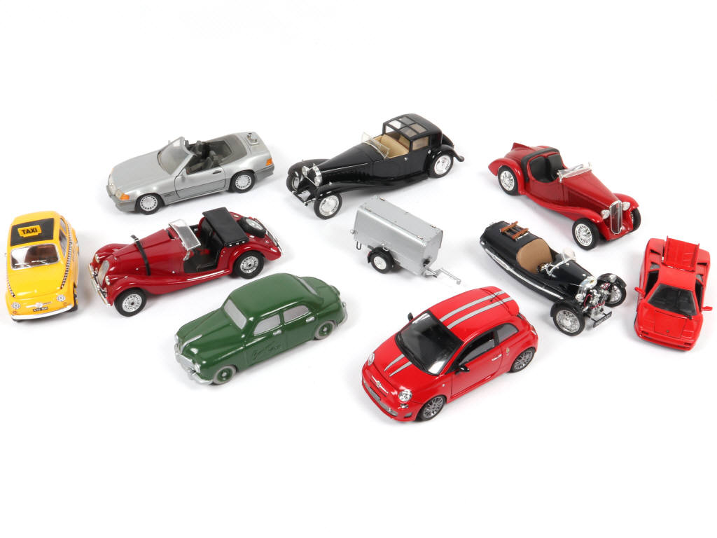 différentes échelles & compositions - avec manques & parties cassées - on y retrouve notamment les marques : SOLIDO, WELLY, MONDO MOTORS, POLISTIL, BBURAGO & MAISTO