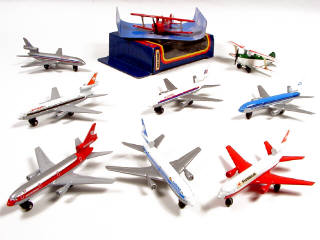 miniatures reproduisant les appareils : PITS & DC-10 - on y retrouve les compagnies : SABENA, UNITED, SWISSAIR, AEROMEXICO, KLM & AMERICAN - modèles fabriqués en Grande Bretagne, à Macau & en Thaïlande - un modèle avec boîte & un autre avec premier train d'atterrissage RARE !