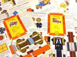 collection 'BOLIDES D'AUTREFOIS' - comprend les marques : RENAULT, ROCHET SCHNEIDER, MERCEDES, DE DION, MARCUS, RICHARD (UNIC), PANHARD & LEVASSOR, SERPOLLET, HEAVY SURREY, RUMPLER, PEUGEOT, BERLIET, DURYEA, CITROËN, HAUTIER, ALFA ROMEO, OLDSMOBILE, FORD, ROLLS ROYCE, FIAT, DELAHAYE, JEANTAUD & CADILLAC - une planche avec un élément détaché - traces de poussière sur quelques planches - ces montages en carton étaient offerts par les stations-services SHELL dans les années 60