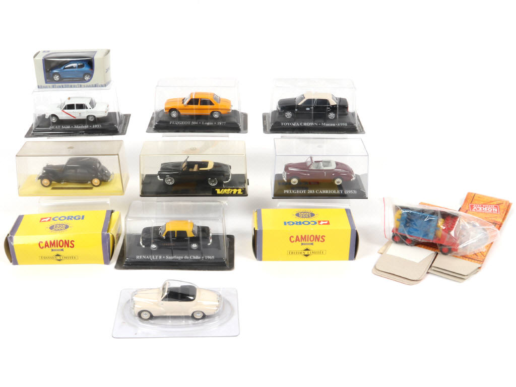 comprend notamment les marques : LEGO, SOLIDO & CORGI TOYS - possibilité de manques ou parties cassées - on y joint un ensemble de boites vides de la marque NOREV