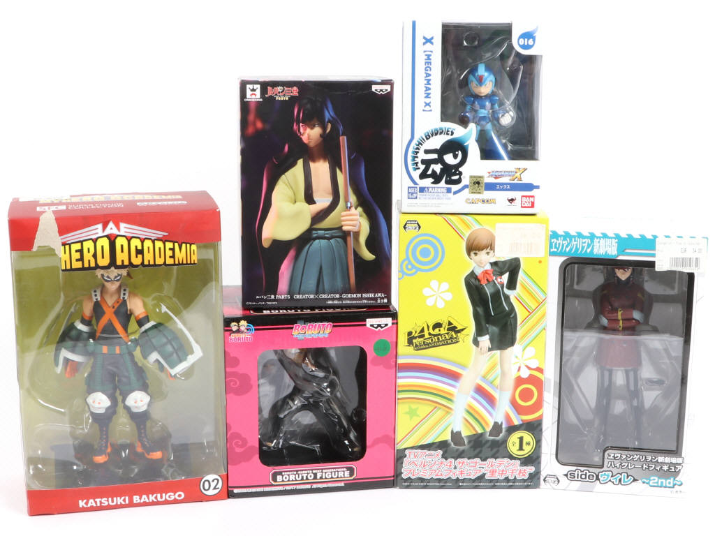 scellé - on y retrouve les univers NARUTO, MEGAMAN, HERO ACADEMIA, EVANGELLION, PERSONNA 4 & GOEMON ISHIKAWA - comprend les marques BANDAI & BANPRESTO - une boite ouverte