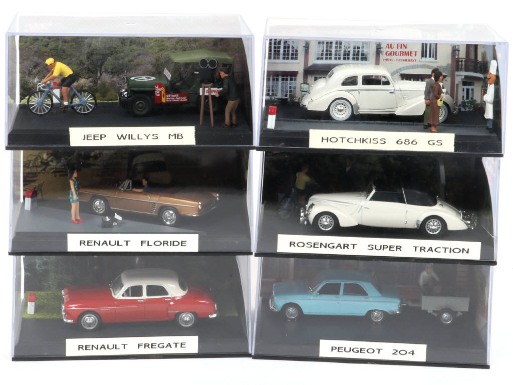 comprend les modèles : JEEP WILLYS, HOTCHKISS, RENAULT FLORIDE, ROSENGART SUPER ACTION, RENAULT FREGATE & PEUGEOT 204 - étiquettes ajoutées sur les socles