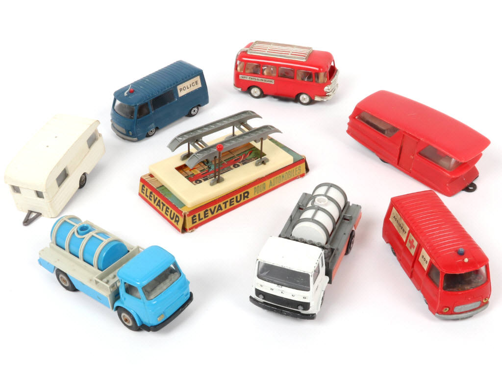 on y retrouve les marques : NOREV, MINIALUXE & POLITOYS - avec manques & parties cassées - on y joint un pont élévateur en état 'A'-'c'