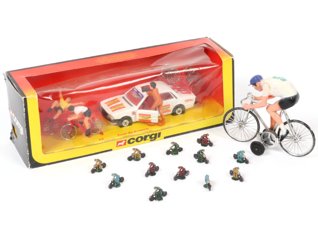contient : PEUGEOT 505 STI 'RALEIGH', 4 vélos, 2 cyclistes & entraineur - blister de boîte décollé & déchiré - on y joint un coureur cycliste (hauteur 9,5 cm, état 'B', réalisation en plastique, légèrement sali, moteur à friction fonctionne) & 12 autres coureurs clyclistes en métal (états 'C' & 'D') non d'origine
