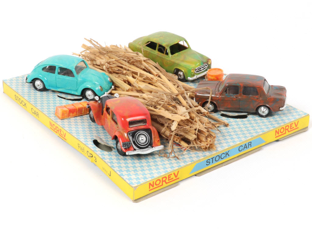 contient : SIMCA 1000, VOLKSWAGEN 1300, CITROËN TRACTION 11A, PEUGEOT 403, un bloc de 4 caisses, un fût & 2 bottes de paille (éparpillées, manque liens) - quelques petits manques de papier sous le socle de boîte (légèrement déformé, mica très légèrement jauni & déformé)