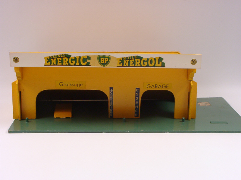 dimensions : 53 x 28 x 17,5 cm - en isorel - manque vraisemblablement un élément sur le côté latéral droit - sans pompe à essence - 53 x 28 x 17.5 cm - plywood - apparently missing one element from the right-hand side panel