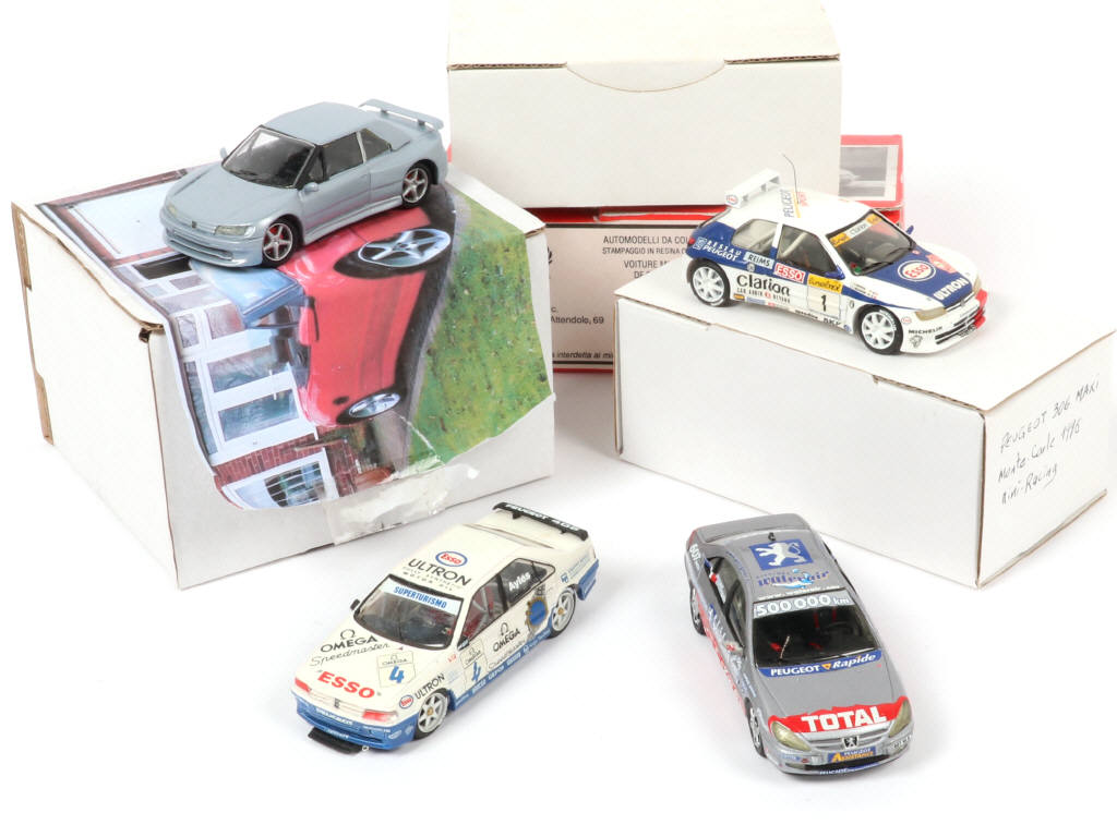 réalisations en résine - comprend les modèles : 306, 406 & 607 (état 'B') - on y retrouve les marques : CAMMA, JPS, MINI RACING & MINI TEAM - quelques accessoires à repositionner, manquants & d'autres cassés (suivant les exemplaires)
