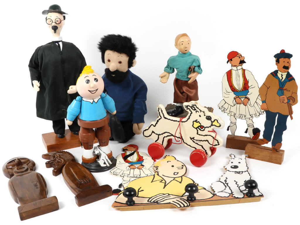 comprend : totems en bois exotique, grand figurine TOURNESOL en composition, poupée HADDOCK, boite à musique (moteur bloqué) & figurine en bois TINTIN, MILOU à roulettes, porte-manteau & figurines en contreplaqué peintes (un pied de DUPOND cassé & manquant)