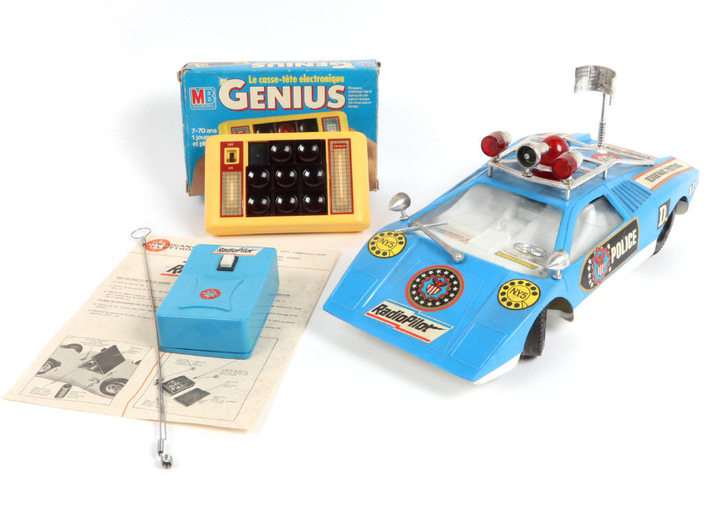 longueur 43 cm - avec moteur à pile (non testé), notices & télécommande - légèrement encrassée, possibilité de petits manques & parties cassées (accrocs & déchirures sur la boîte) - on y joint un jeu GENIUS Le casse-tête électronique de marque MB ELECTRONICS (non testé, légèrement encrassé, boîte en état 'c')