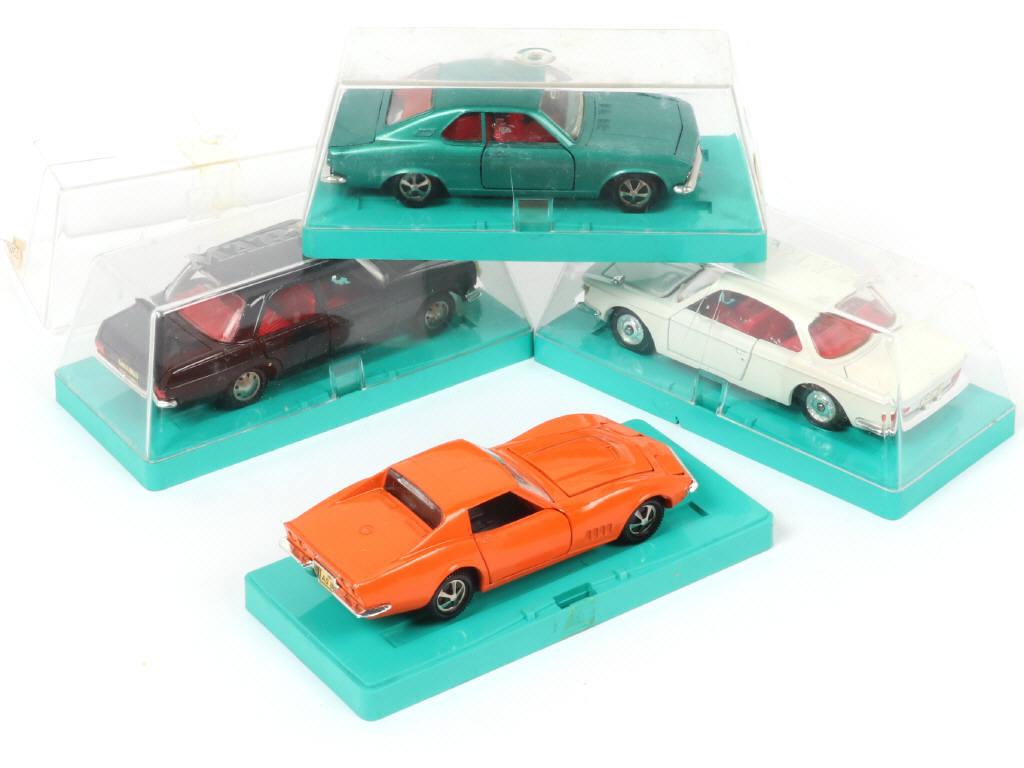 miniatures reproduisant les modèles : CHEVROLET, OPEL, MERCEDES & BMW - les boîtes sont en états de 'b' à 'd' (2 fixations manquantes)