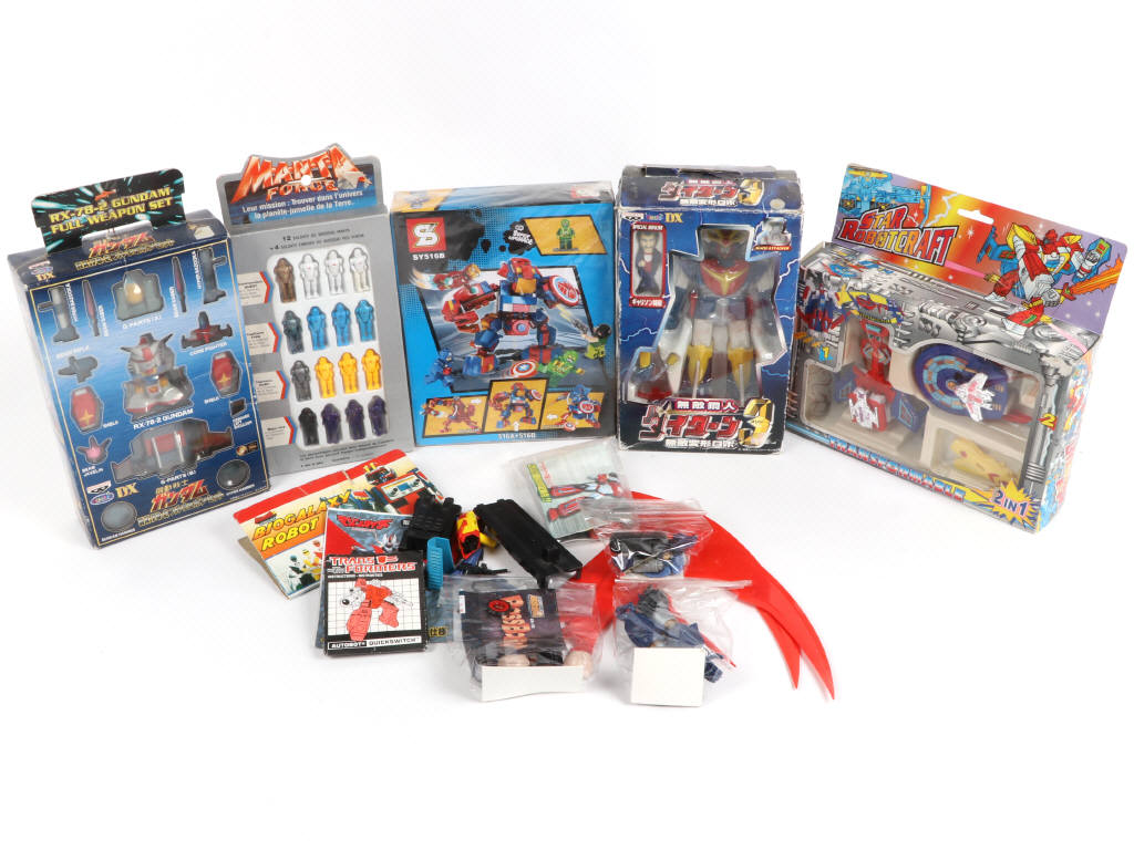 jamais ouverts - on y retrouve notamment les modèles : STAR ROBOTCRAFT, MANTA FORCE & RX-78-2 GUNDAM - on y joint une reproduction des LEGO MARVEL HEROES ASSEMBLE réf SY516B (jamais ouvert) - états des boîtes de 'a' à 'c' (avec accrocs, déformées & déchirées)