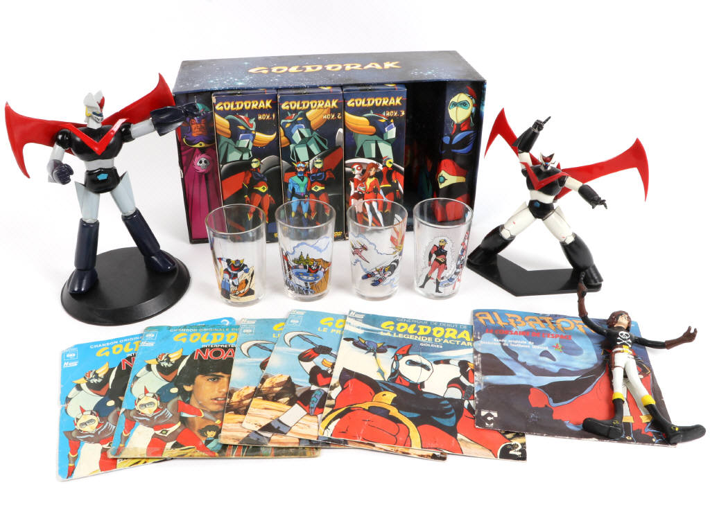 avec socles de présentation - quelques frottements - on y joint un coffret DVD incomplet, 4 verres, 6 vinyles 44t GOLDORAK & ALBATOR (certains déformés & déchirés par endroits) & une figurine ALBATOR