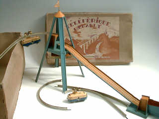 Coffret produit en 1934 - longueur du circuit monté : 84 cm - les deux cabines ('C') sont équipées de moteur à ressort & fonctionnent parfaitement - losanges RENAULT sur tôle lithographiée - TRES BEL ENSEMBLE COMPLET, EN ETAT EXCEPTIONNEL DE CONSERVATION !