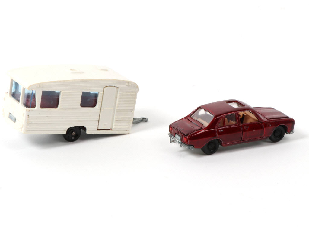MAJORETTE (FRANCE) 340 PEUGEOT 504 & caravane digue bordeaux & blanc
