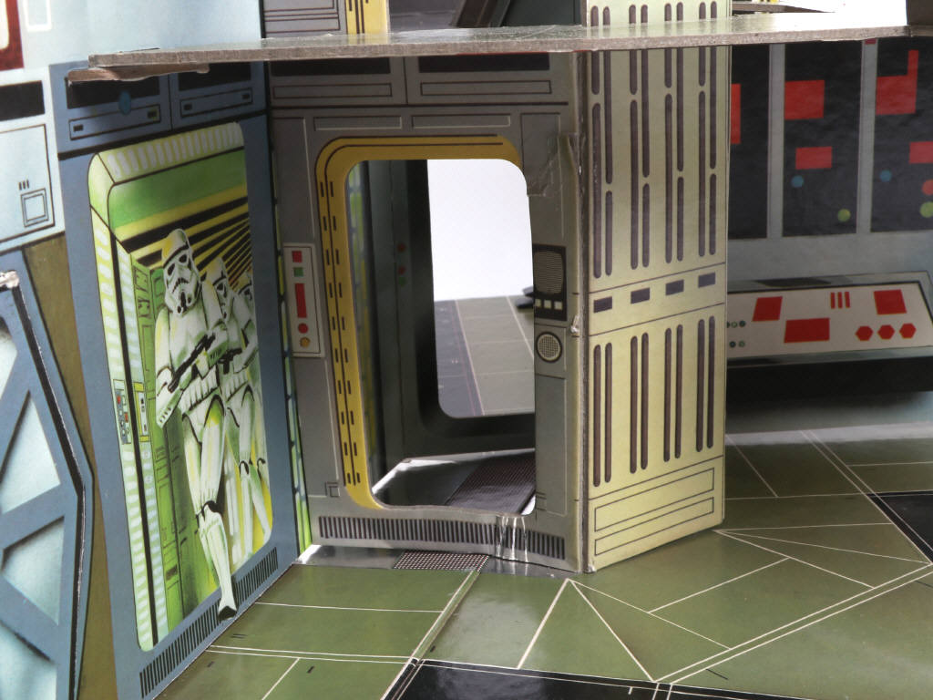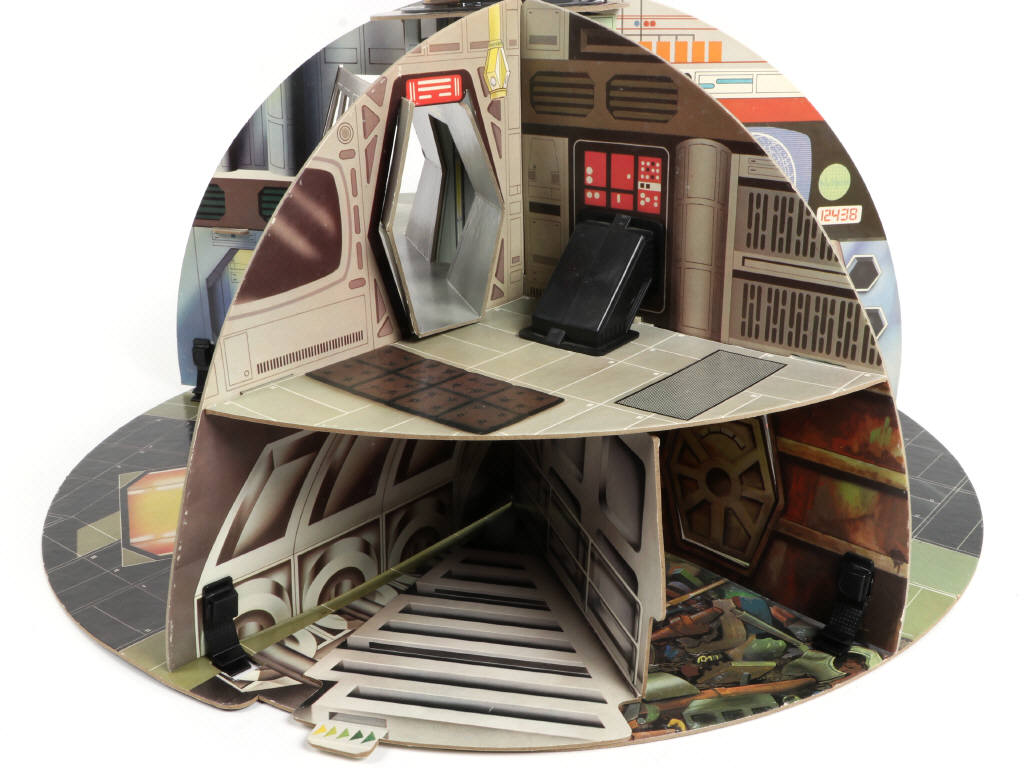 année 1979 - complet, avec cockpit (capot jauni) & 2 armes, notice et boite (usée mais complète, un rabat déchiré, pliures & frottements) - tous les éléments en plastique sont présents & intacts, la porte battante également mais détachée au niveau de la charnière - quelques déchirures minimes à l'intérieur & traces d'usure légères - TRÈS TRÈS BEL ÉTAT POUR UN OBJET AUSSI RARE !