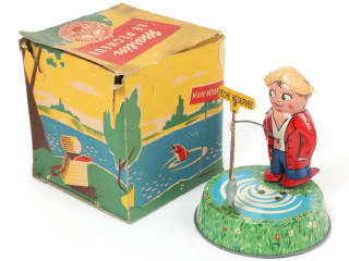 dimensions : 13 X 15,5 cm - moteur à ressort (fonctionne) - en action, le pêcheur tourne sur lui-même tandis que sa ligne avec le poisson s'enroule autour du panneau indicateur puis se déroule