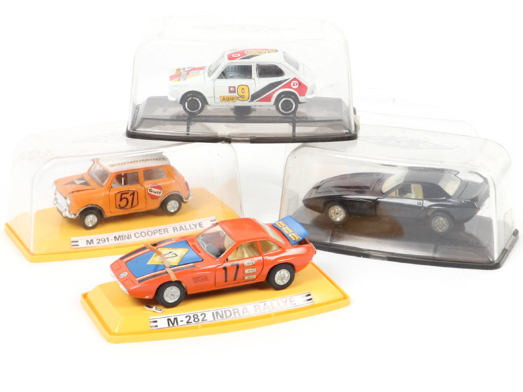 on y retrouve les modèles : MINI COOPER Rallye, INDRA (2 exemplaires différents, une petite pièce à recoller) & SEAT 127 - quelques frottements sur les couvercles de boîtes