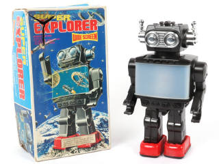hauteur : 29 cm - mécanisme à piles & système lumineux (à revoir) - une fixation de trappe de piles cassée & manquante - une importante perforation sur le couvercle de boîte