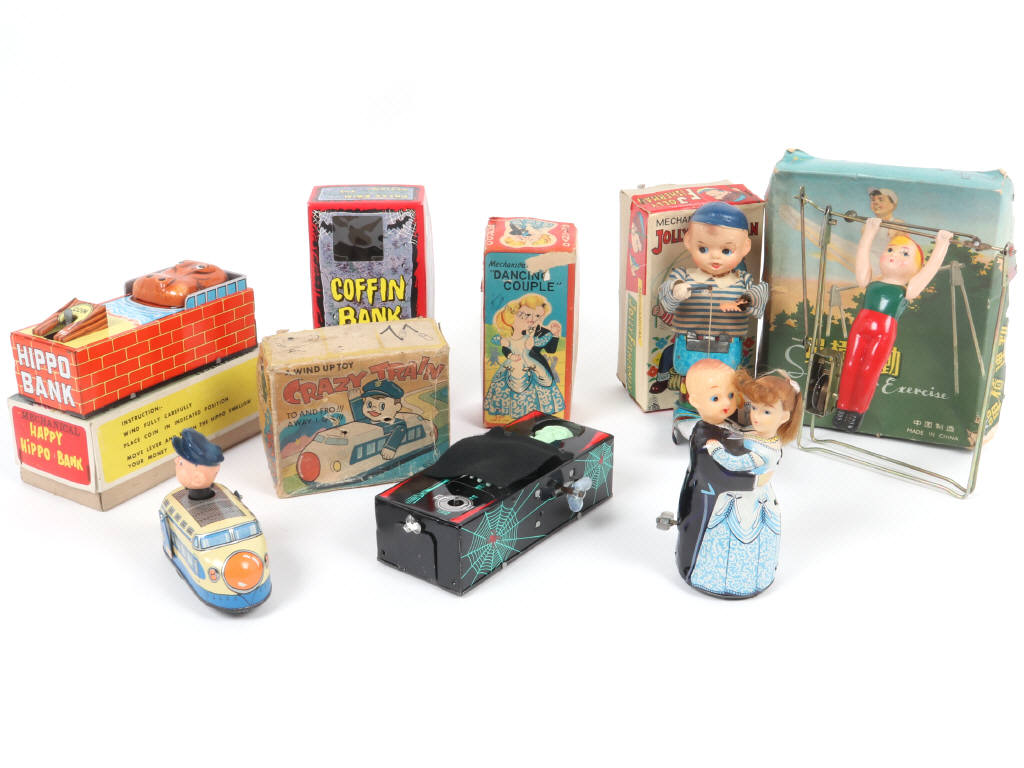 hauteur du plus grand exemplaire 19 cm - mécanismes fonctionnels - on y retrouve notamment les marques YONE & ALPS - boîtes en états 'a' à 'e' - tête du pêcheur endommagée (petits impacts avec vêtement taché, avec un poisson)