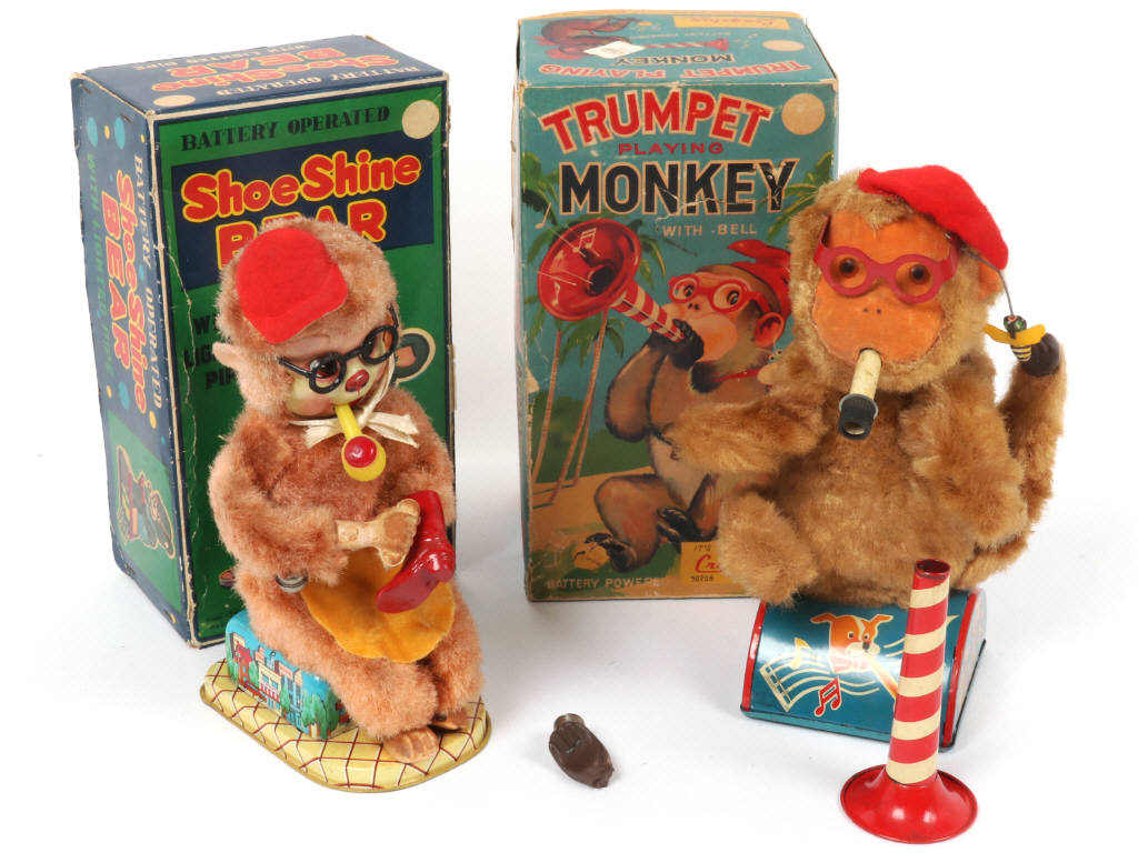 hauteur du singe : 23 cm - avec mécanismes à piles & systèmes lumineux (ensemble à revoir) - on y retrouve les marques : NOMURA & FUKUDA (extrémités des membres en caoutchouc séchées, craquelées & incomplètes) - les boîtes sont en état 'c'