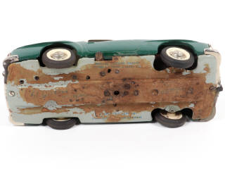 longueur 22 cm - avec direction, moteur à piles, système à clef faisant tourner le gyrophare & émetteur-récepteur mobile (ensemble non testé) - légèrement encrassé & traces d'oxydation importantes sur le plancher - boîte (cales manquantes), déformée & déchirée par endroits