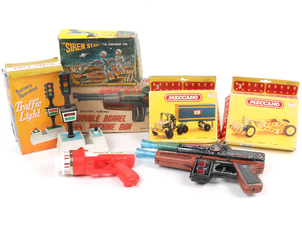 on y retrouve les marques : MECCANO (possibilité de petits manques), ROSKO (fonctionne mais un seul canon bouge) & THE SPACEMAN'S GUN (à revoir) - on y joint TRAFFIC LIGHT (non testé) - états des boîtes 'c' & 'd' (certaines déchirées, déformées & avec accrocs plus ou moins importants par endroits)