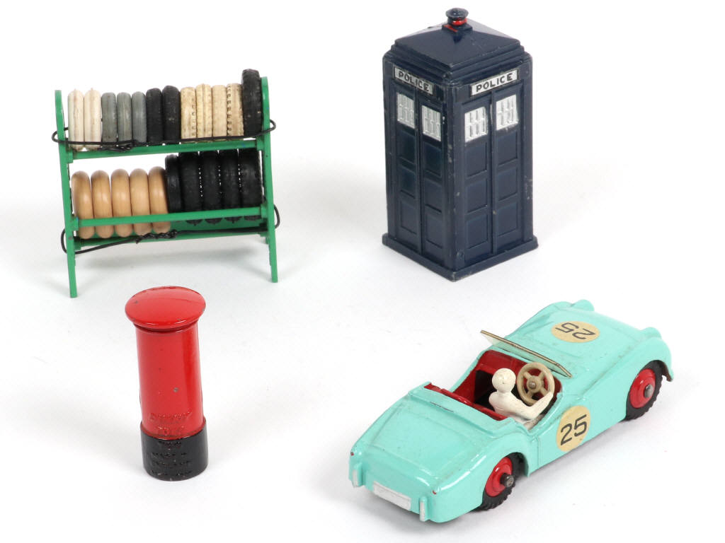 un défaut de moulage sur l'intérieur d'une jante - on y joint une cabine de police (état 'C'), un rack à pneus (état 'A', 22 présents, ensemble séché avec certains exemplaires non d'origine) & une boîte aux lettres (état 'B') de la marque