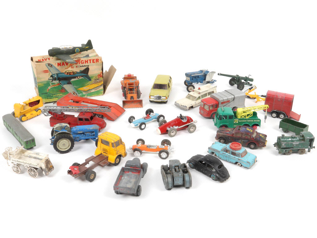 on y retrouve notamment les marques : SCHUCO, DINKY TOYS, MARKLIN & MATCHBOX - on y joint une locomotive, 2 wagons & une pièce d'artillerie - une boîte en état 'd' - avec manques & parties cassées