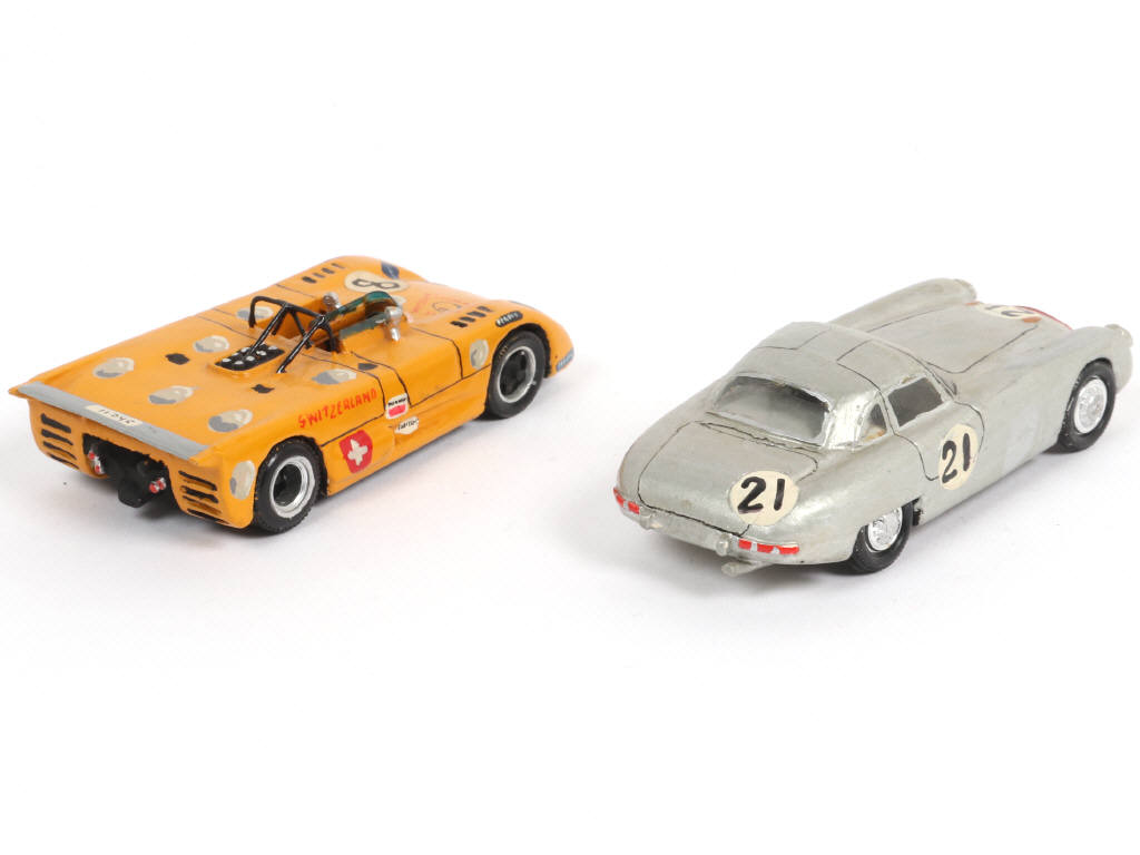créations artisanales en bois peint de 1970 & 1973 - comprend les modèles : MERCEDES BENZ 300 SL 1952 (MANOU) & LOLA T280 1972