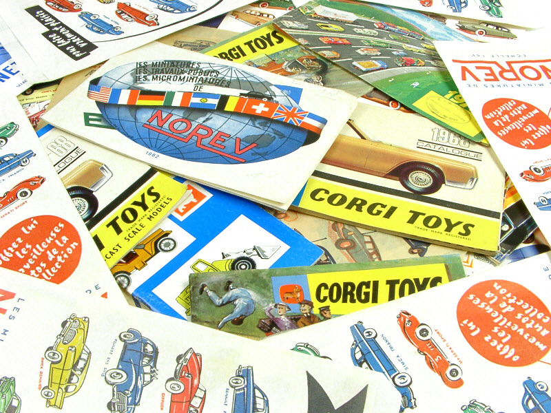 on y retrouve les marques : NOREV, CORGI TOYS, SIKU, MÄRKLIN, GUISVAL, MINIATURES RENAULT & SCHUCO - on y joint 9 sachets illustrés en papier, 4 buvards illustrés & 2 affichettes de marque NOREV