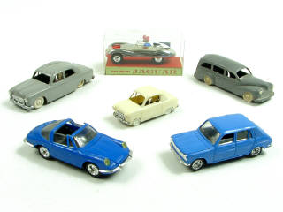 miniatures reproduisant les marques : PEUGEOT, VESPA, SIMCA, PORSCHE & JAGUAR - un modèle en boîte - 3 modèles avec carrosserie légèrement déformée & 2 en états 'D'