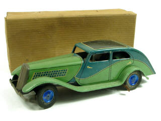 longueur 34 cm - moteur à ressort (fonctionne) - avec direction & chauffeur - traces d'oxydation sur la clef - SUPERBE !