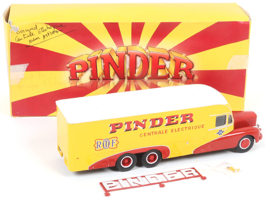 avec 4 auvents ouvrants, sachet de rétroviseurs, enseigne 'PINDER' & cale de boîte - manque les 2 moteurs de la centrale - peinture légèrement craquelée sur le toit