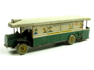 longueur 27 cm - moteur à ressort (fonctionne) - direction - belles illustrations & publicités sur les vitres - ce petit fabricant n'aurait fabriqué qu'un seul modèle au début des années 50 - manque 3 agrafes de toit - BEL ASPECT POUR UN MODELE DE CETTE RARETE !