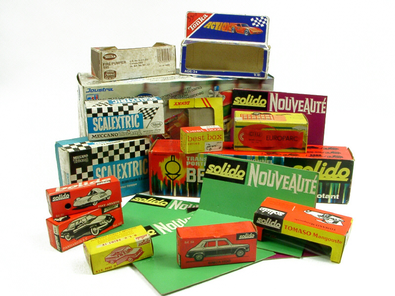 état de 'b' à 'd' - on y retrouve les marques : JOUSTRA, SOLIDO, C.I.J., TONKA, BEST BOX & SCALEXTRIC - les boîtes SCALEXTRIC sont avec cales & notices - on y joint 3 boîtes DINKY TOYS GB en état 'e' (de type blister)