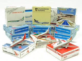 échelle 1/600ème - fabrication de 1982-1992 - on y retrouve les compagnies : TWA, EASTERN, CATHAY PACIFIC, AMERICAN TRANSAIR, SAUDIA, GULF AIR, AIR CANADA, AIRLANKA, WORLDWAYS, ROYAL JORDANIAN, TAP AIR PORTUGAL, ANA, ALIA, BWIA INTERNATIONAL, CALEDONIAN AIRWAYS & DELTA AIRLINES