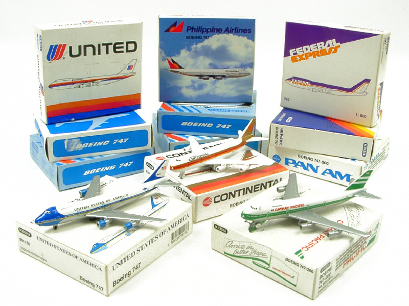 échelle 1/600ème - fabrication de 1982-1992 - on y retrouve les compagnies : LUXAIR, AIR CANADA, IBERIA, FEDERAL EXPRESS, AIR PACIFIC, SABENA, U.S.A., UNITED AIRLINES, CONTINENTAL, PHILIPPINE AIRLINES, PAN AM & CATHAY PACIFIC