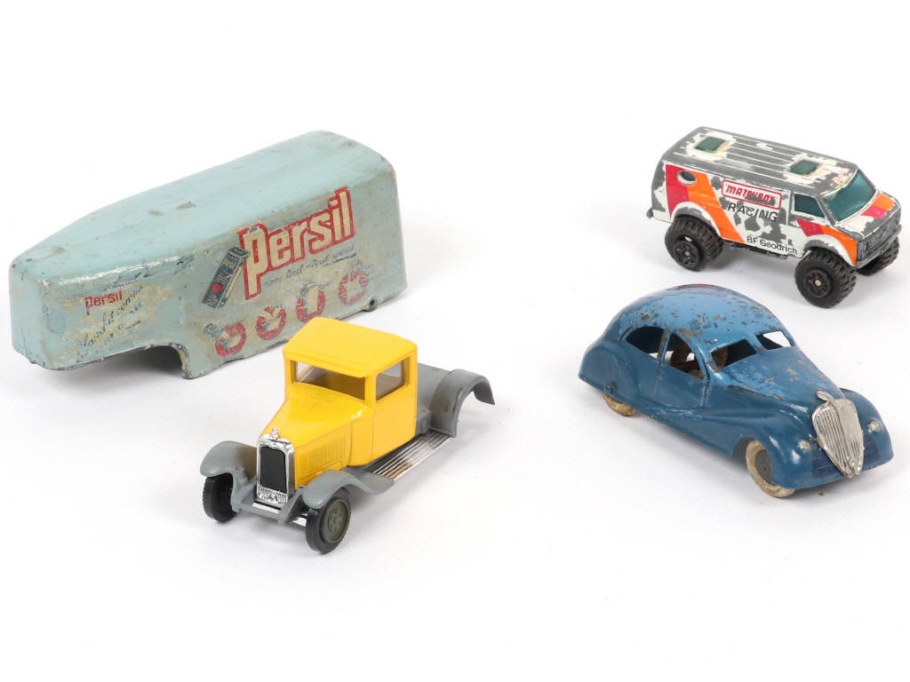 on y retrouve les marques : C.I.J, MATCHBOX & SOLIDO - on y joint une remorque 'PERSIL' de la marque D.C en état 'R' (publicités incomplètes, non repeintes, RARE !) - avec manques & parties cassées