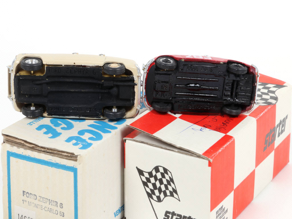 miniatures reproduisant les modèles : FORD ZEPHYR 6 (un essuie-glace à repositionner - avec notices) & SAAB 96S (avec notice - boîte non d'origine)