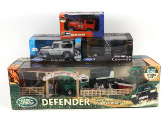 longueur du plus grand exemplaire : 61 cm - contient : LAND ROVER, figurines, animaux & accessoires - semble complet (jamais déballé) - on y joint 3 LAND ROVER des marques WELLY & TIME 4 TOYS