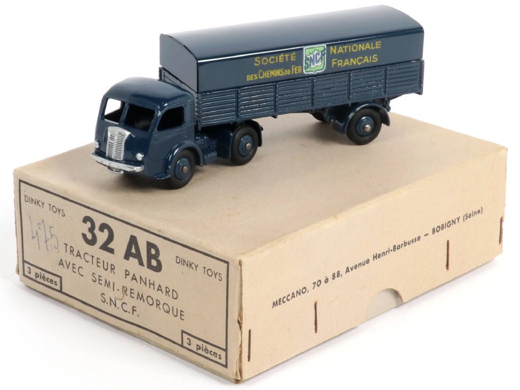 DINKY TOYS (FRANCE) 32AB PANHARD Semi-remorque 'S.N.C.F' (version avec intérieur de toit quadrillé) bleu foncé (fond de l'écusson uni)