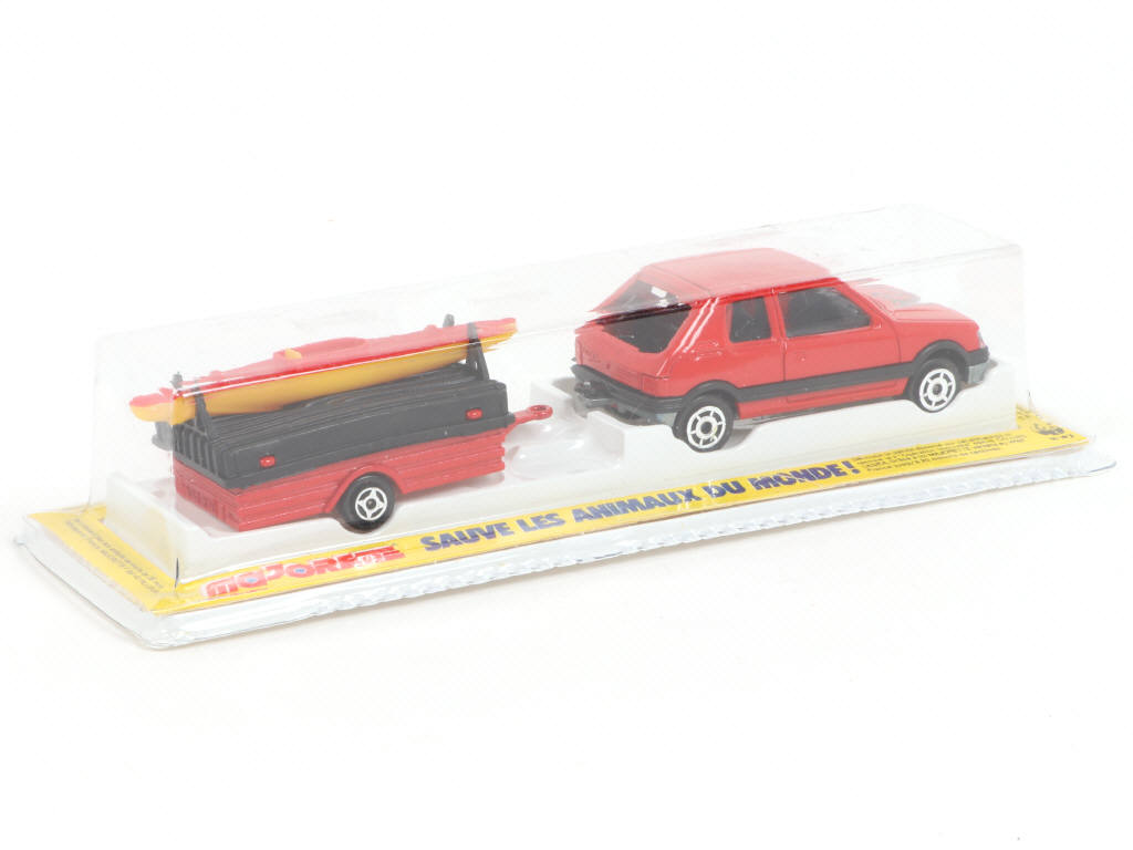 MAJORETTE (FRANCE) 372 PEUGEOT 205 GTI & remorque canoë rouge & noir