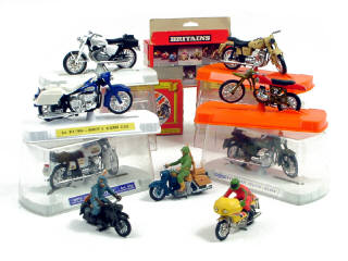 comprend : une HONDA 750 de police, 3 motos GUZZI (civile, police & militaire), une HARLEY DAVIDSON ELECTRA GLIDE & une BULTACO CROSS PURSANG MARK 4 - on y joint 3 motos de marque BRITAINS avec boîtes