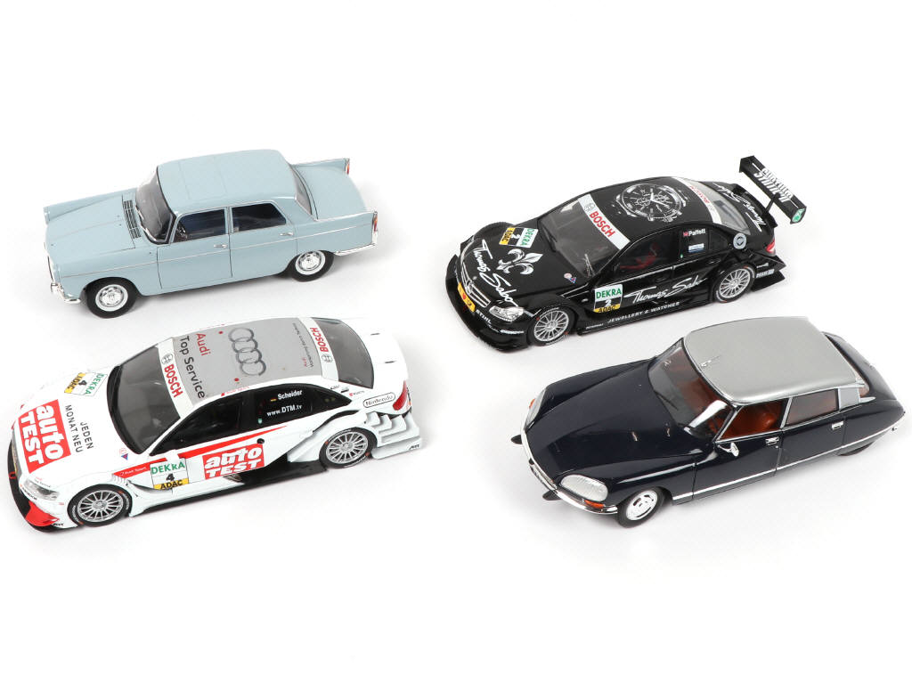 échelle 1/18ème - on y retrouve les modèles : CITROËN DS 23 PALLAS, AUDI A4 DTM, PEUGEOT 404 & MERCEDES CLASSE C DTM - possibilité de petits manques & parties cassées