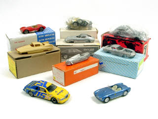miniatures reproduisant les véhicules : MASERATI, FERRARI, AUTO UNION, MERCEDES, BENTLEY & FORD - on y retrouve les marques : AUTO REPLICAS, EQUIPE, PROGETTO K, STARTER, TRON, IDEA3, HOSTARO & JOHN DAY - 6 modèles non montés paraissant complet