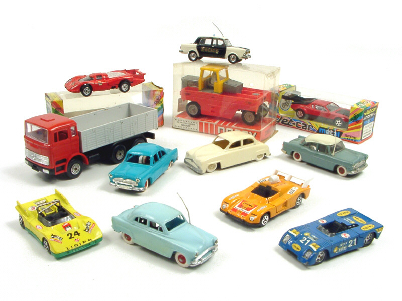 états de 'A' à 'C' - miniatures reproduisant les véhicules : SIMCA, MERCEDES, CHEVRON, LIGIER, ALPINE, RICHIER, DE TOMASO & PORSCHE - 3 modèles avec boîte - quelques manques sur un modèle - on y joint une SIMCA 1000 POLICE (suspensions transformées) & une SIMCA ARONDE avec moteur à friction de marque MINIALUXE