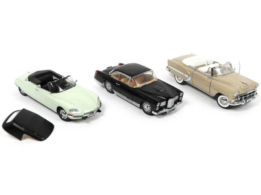 échelle 1/18ème - on y retrouve les modèles : CITROËN DS 21, FACEL VEGA HK 500 & 1953 BEL AIR - modèles légèrement encrassés - différentes traces par endroits sur les carrosseries de certains modèles