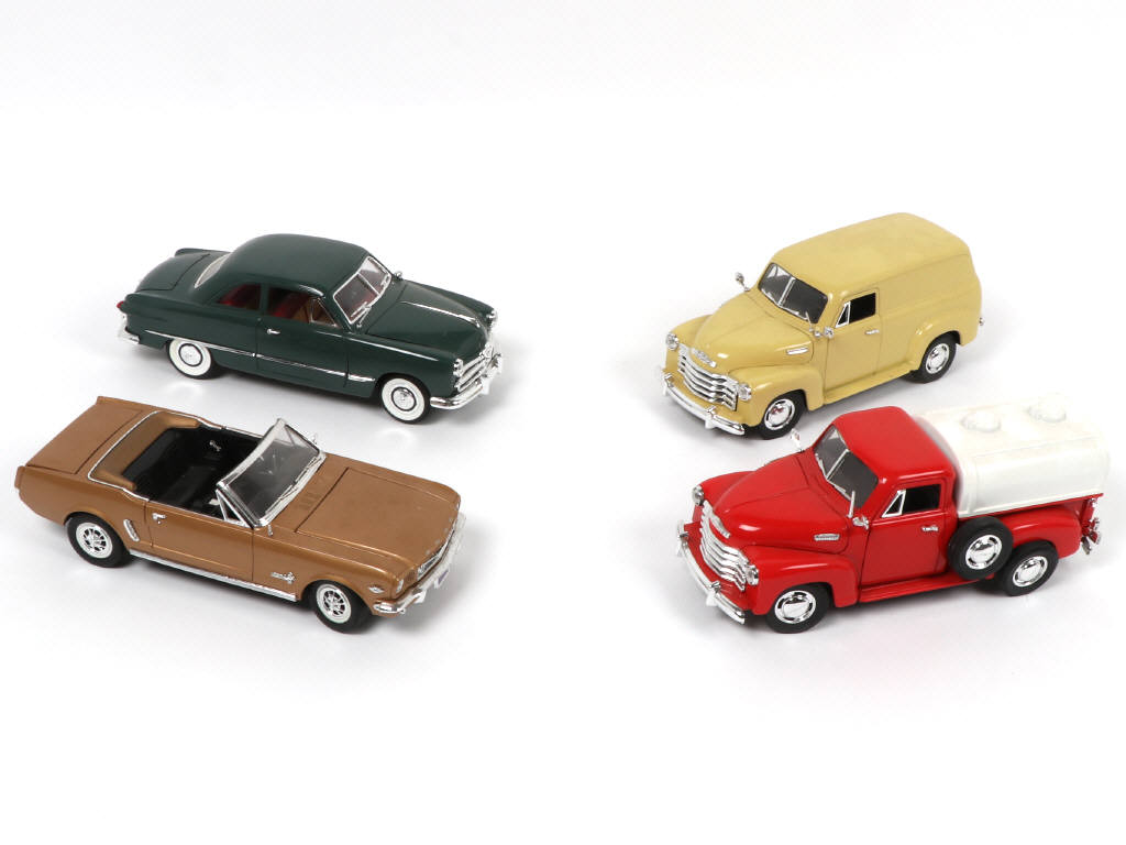 échelle 1/18ème - on y retrouves les modèles : CHEVROLET PICK UP 1953, CHEVROLET PANEL 1950 FORD 1949 & FORD MUSTANG 1964 - modèles légèrement encrassés - roue cassée sur l'un des véhicules