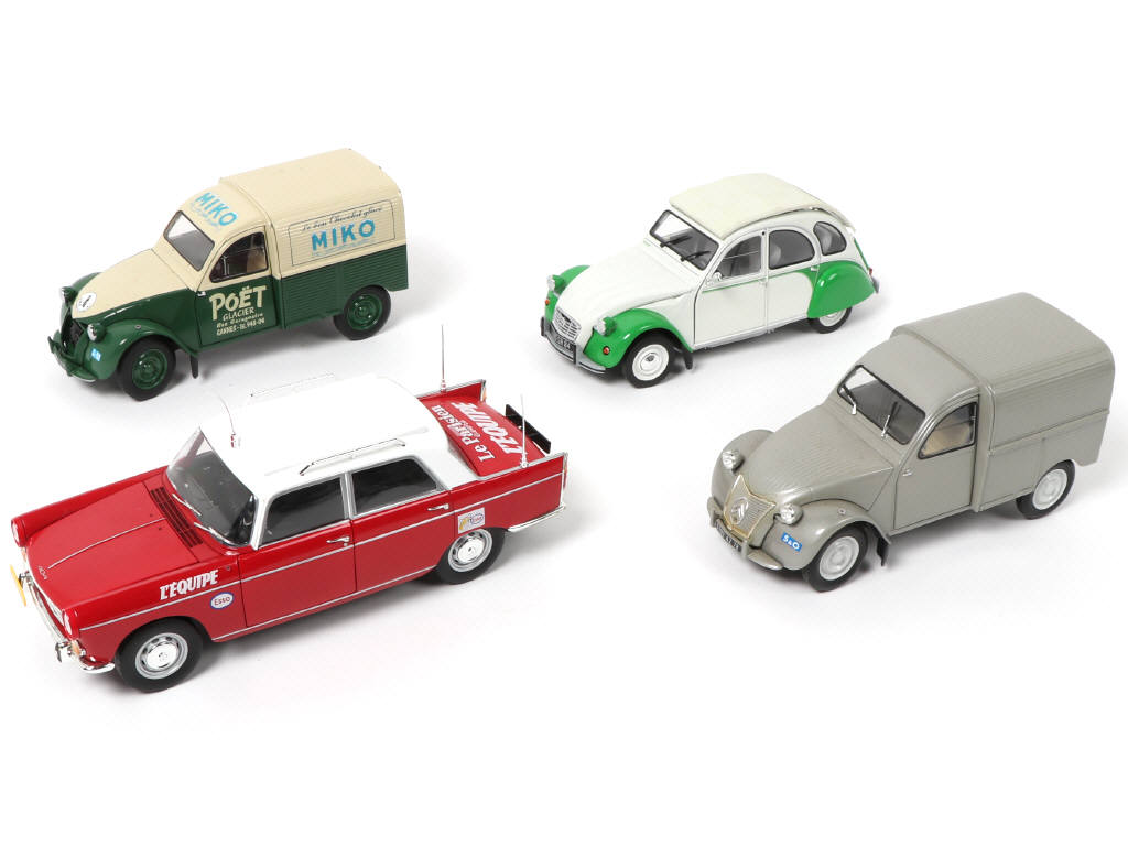 échelle 1/18ème - on y retrouve les modèles : CITROËN FOURGONETTE 2CV, CITROËN 2CV & PEUGEOT 404 DIRECTEUR DE COURSE - modèles légèrement encrassés - petits manques & parties cassées